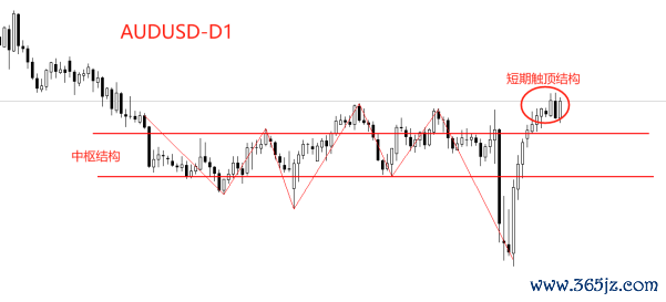 走势结构角度看,日线级别,AUDUSD从去年底开始形成中枢结构,截至目前中枢结构都未遭到破坏。4月9日前后的大跌和大涨,都围绕中枢结构展开,市价仍受到中枢的回拉作用。最近一周,AUDUSD的日线呈现短线触顶迹象,如果不能出现决定性的长阳线,未来极有可能向中枢结构下轨回落。