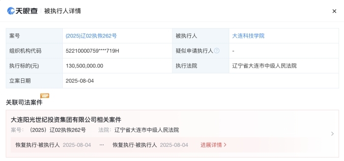 学院共有2条被执行人信息,被执行总金额超2.3亿元;共有35条历史被执行人信息,被执行总金额超35亿元。其中,8月4日新增1则恢复执行信息,执行标的超1.3亿元,执行法院为辽宁省大连市中级人民法院。大连科技学院属于多个被执行人之一,与大连华通夕阳红房屋开发有限公司涉及3起案件。
