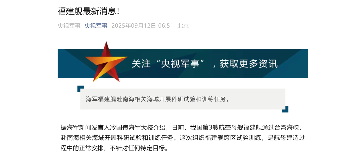 9月12日,据冷国伟大校(海军新闻发言人)介绍,日前,我国第3艘航空母舰“福建”舰通过台湾海峡,赴南海相关海域开展科研试验和训练任务。